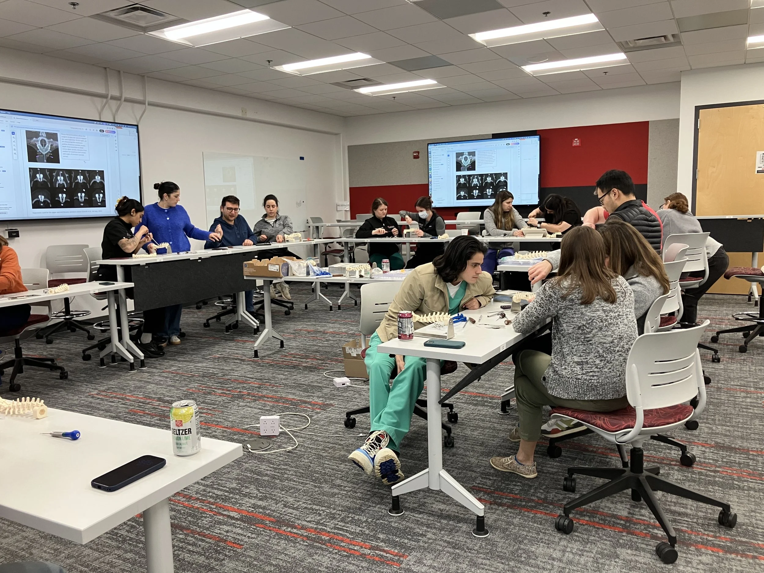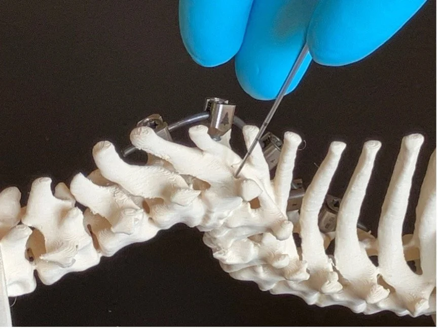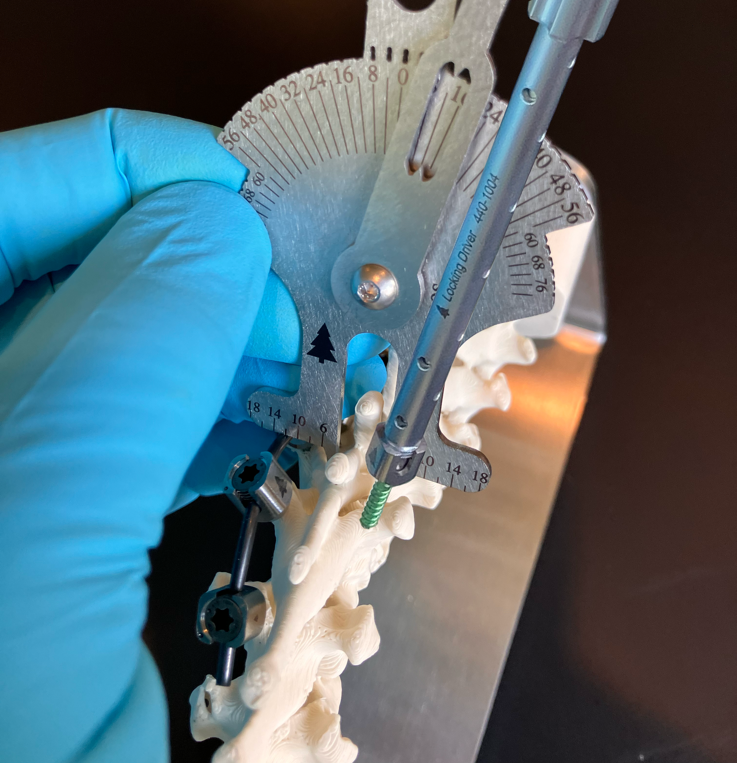 The lab portion uses equipment from the Boreal Sciences, Bolt - Mini Polyaxial screw system along with a 3D printed model of a French Bulldog vertebral column. Participants will apply what they see in lecture to the vertebral column model.