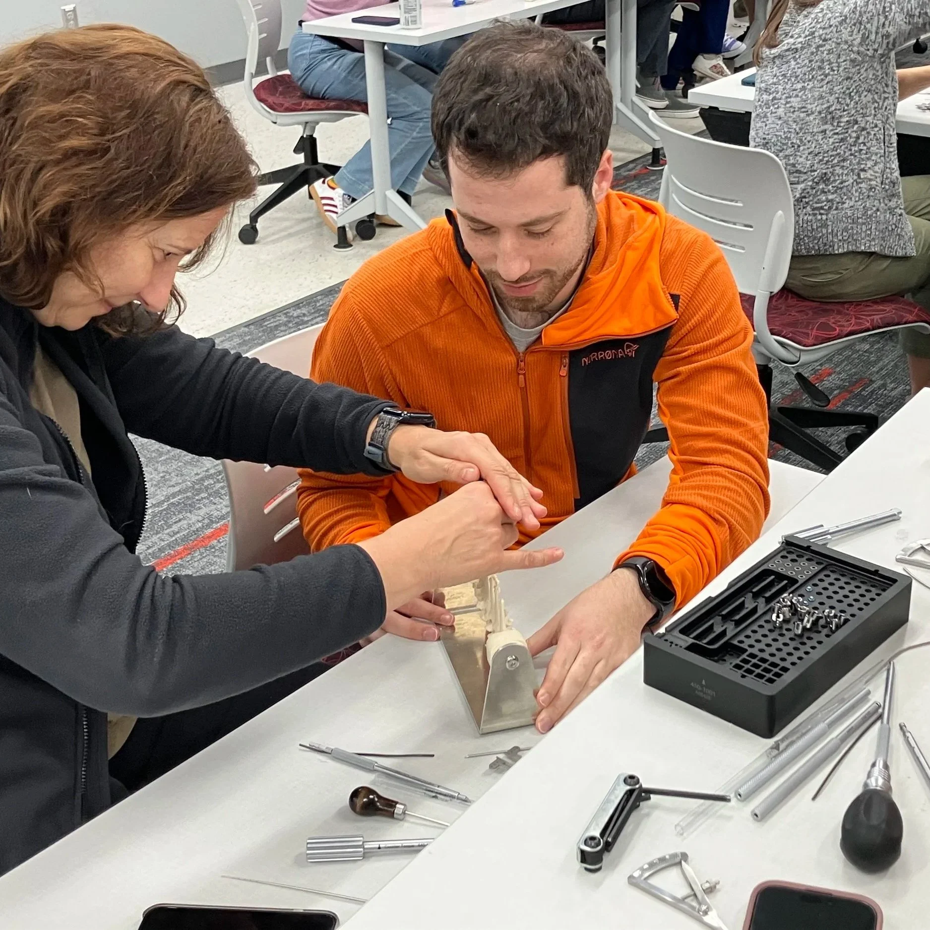 The lab portion uses equipment from the Boreal Sciences, Bolt - Mini Polyaxial screw system along with a 3D printed model of a French Bulldog and Pug vertebral column. Participants will apply what they see in lecture to the spinal model.